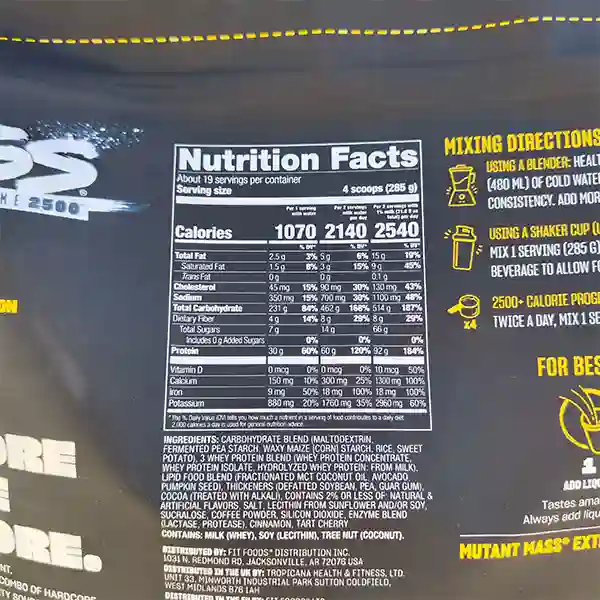 به عنوان یک مکمل غذایی، 16 اونس (480 میلی لیتر) شیر کم چرب را به مخلوط کن یا فنجان شیکر بزرگ اضافه کنید، سپس 1 پیمانه (4 پیمانه) MUTANT MASS EXTREME 2500 اضافه کنید، مخلوط کنید یا به مدت 20 تا 30 ثانیه تکان دهید. دوبار در روز مصرف کنید.