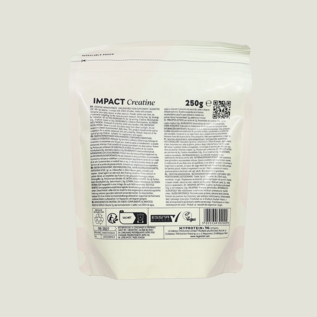 کراتین، سلطان مکملهای بدنسازی است و کراتین مونوهیدرات ایمپکت مایپروتئین (Myprotein Impact Creatine) یکی از خالصترین و اثربخشترین انواع آن است. این محصول با تأمین 3 گرم کراتین مونوهیدرات خالص در هر سروینگ، دقیقاً همان دوز روزانه لازم برای اشباع ذخایر کراتین عضلات و افزایش عملکرد فیزیکی شما را فراهم میکند.